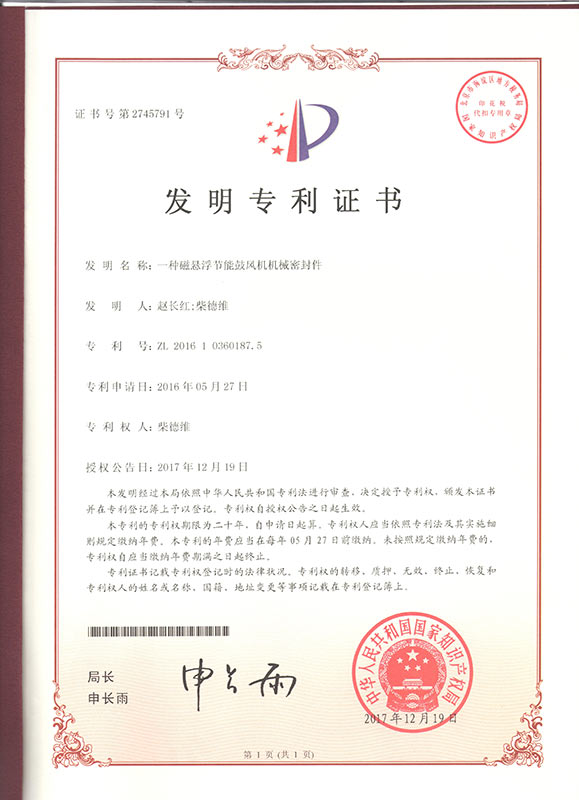 一種磁懸浮節能鼓風機機械密封件發明專利證書